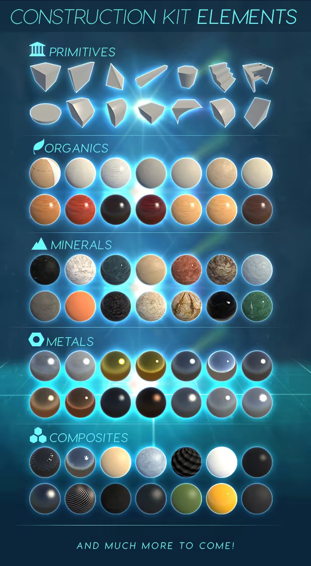 元论建筑 Kit是一个虚拟环境,用于构建自己的3D创建. 构建任何你能想到的利用二十四个结构元素,以及即将释放的机械和技术元素. 以任何风格制作你的作品,有64种材料类型,如有机物,金属,矿物,和复合材料. 完成后,把它们出版到工作室, 供其他人在Metaverse宇宙中继续发展, 供玩家融入他们的行星定居点。