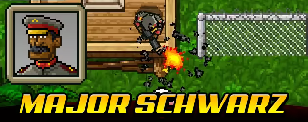 Major Schwarz was totally incompetent and dropped every weapon he ever held, so they promoted him up the chain of command and gave him a crate of grenades. He’s not accurate, but he’s got butterfingers and grenades in volume.