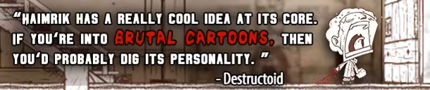 In an added touch, Haimrik will undoubtedly die many horrific deaths, leaving pools of red blood contrasting with the otherwise plain monochromatic sepia world. Be part of a medieval revolution against the Word King and his elite warriors, and change the way you see words and stories forever.