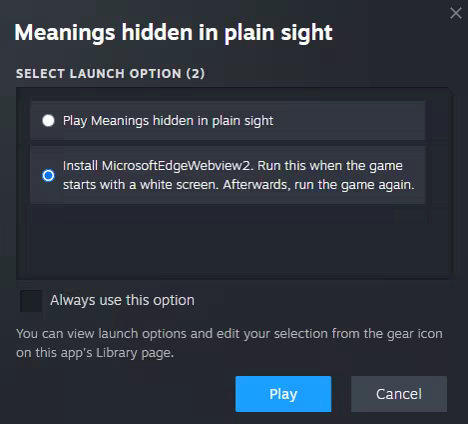 Meanings hidden in plain sight is a captivating word-guessing game which tickles your brain in all the right spots! Either play in PvP mode designed for Twitch, where quick wit and sharp observation skills are your greatest assets. Compete in real-time live with other viewers as you decipher hidden meanings in a series of images, trying to be the first to find a meaning to get the points for it. Prefer a more relaxed approach? Fret not, go and test your wit in singleplayer mode where you play just for your fun. Either way, you'll see lots of carefully curated images, all captured by the developer. Each round presents a new image, challenging you to spot and guess the meanings that hide within. With every correct guess, you inch closer to the top of the leaderboard, visible to all as you climb your way to victory. The game keeps the competition fierce and the atmosphere lively with unique sounds signaling each solved meaning. And with randomly chosen meanings from a vast pool associated with each image, the game offers lots of replayability—two rounds being the same is almost impossible. The host - either a streamer or you when playing alone - has the flexibility to customize the point distribution, adjusting the value of longer or shorter words to match their preferences. If you enjoy word-guessing games, Meanings hidden in plain sight promises a unique and competitive experience that will keep everyone on their toes. Due to the platform Meanings hidden in plain sight is built upon it isn't possible to use Game Capture in software like OBS to capture the gameplay. Please use a Window Capture instead. So far I wasn't able to get the Application Audio Capture (BETA) to work with Meanings hidden in plain sight either. The audio only comes out via the Desktop Audio line at the moment. Should you find a way to get the Application Audio Capture to work I'd appreciate a message via Discord on how you got it to work. On Windows you will need to either have the latest Microsoft Edge or Microsoft Edge WebView2 installed. This is due to the platform Meanings hidden in plain sight is built upon. I decided against other platforms as they'd ship a significantly bigger package. Should the game not start on your machine / start but only show a white screen please run the Install MicrosoftEdgeWebview2 start option and then try to play the game again. Should the error persist please reach out to me.