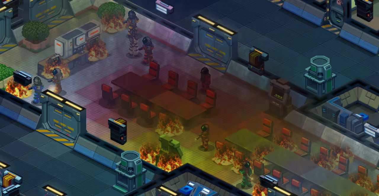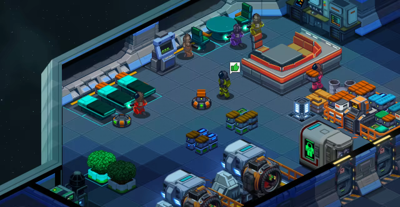 以等距方块拼贴而成的气体系统可以模拟飞船上的各种气体、温度和船员舒适度。人类、植物和设施会对其周围环境做出反应,从而为你设计的飞船和你创造的生活条件赋予意义。请确保设施安全,优化船员的生存水平和福祉,但同时也要考虑到未来可能发生的事故,以及船员战斗或环境危害造成的混乱。