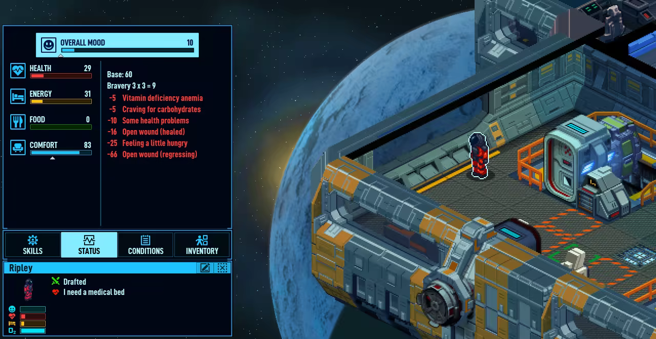 技能和特质 - 每位船员都有自己的技能组合和特质。懦夫可能连开枪都会害怕,消化能力强的人吃什么东西都不受影响。