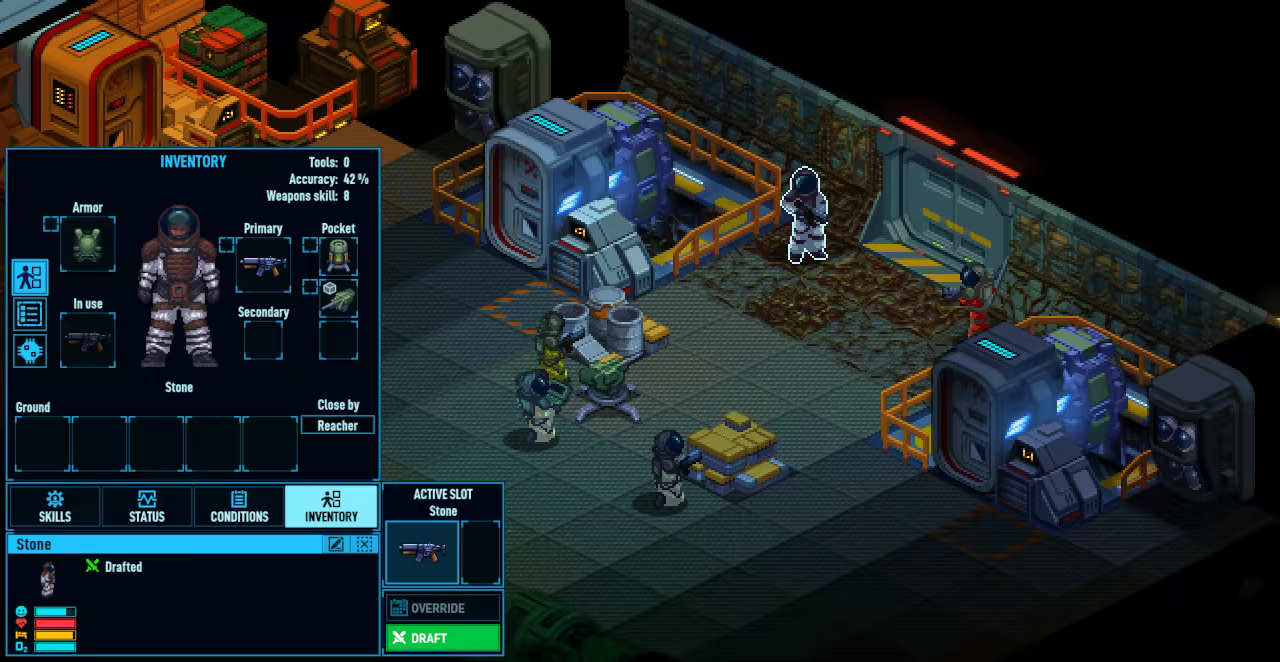 物品栏 - 每位船员都有自己独特的物品栏。请为其装备手枪、步枪、手榴弹等武器。