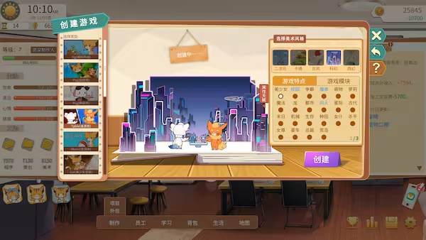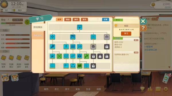 只有平衡各项身体指标,才能够有更好的状态去学习提升编程、策略、美术、音乐等各项能力。随着能力的解锁,甚至打造一款广受好评的3A大作也成为可能。