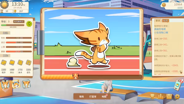 作为一个独立游戏开发者,你需要维持饱食、清洁、心情、健康等四个状态属性,通过点外卖饱食回复饱食、玩游戏改变心情、洗澡恢复清洁度,同时还需要出门通过跑步、打篮球来保持健康的身体。.