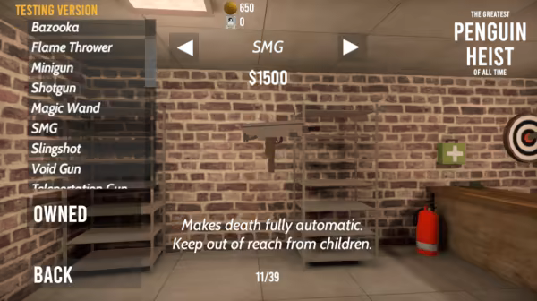 企鹅海斯特受到老派隐秘和抢劫游戏以及现代物理学平台的启发,旨在用现代物理学引擎和多人游戏为流派注入新的生命. 你选择你的任务,你的卸货, 你开始你的任务。 使用你的工具,武器和智慧 潜入,偷盗,并尽可能的撤出。 通过完成探索和探索地图来解锁新武器和新物品,通过将你辛苦赚来的钱花在服装店里来获得最变态的企鹅滴水.