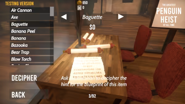 随着游戏的进展,你会解锁新的武器,工具和物品. 这些从普通枪支到无人机,到炸药到食物不等. 每件物品都有特殊功能,可用于完成抢劫. 看到一对企鹅守着门吗? 你可以用炸药和迷你枪把它们炸成遗忘物, 你可以用臭鱼毒死它们, 你可以引诱它们离开并潜入, 你可以扭曲引力和运行过去。