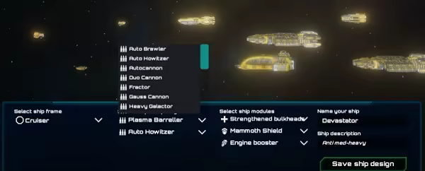 你偶尔会摧毁的敌人会掉下船框,武器或模块的蓝图. 你可以用这些来修改你的单位,并组成一个舰队来打败你的对手.