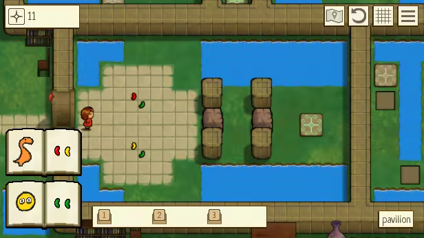 每个谜题都有一套食谱——如何创造各种怪物的指令. 在下面的谜题中,左下角的书籍显示,你可以通过结合红黄豆来创造橙色恐龙外观怪物(一种"滚珠"),也可以通过结合两个绿豆来创造黄色圆形怪物(一种"炸弹").