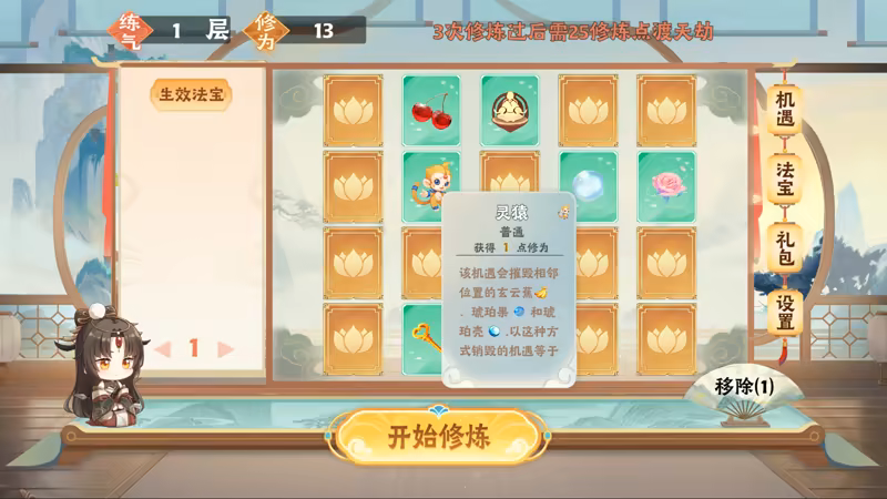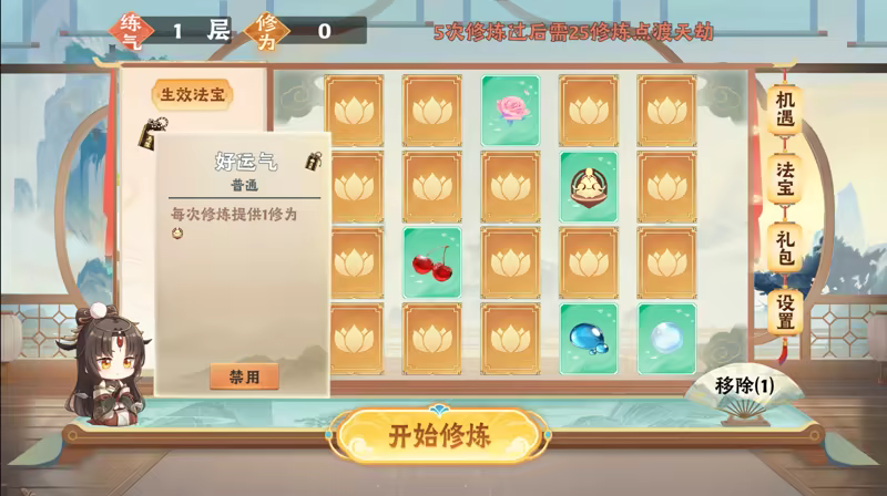 修炼系统:玩家可以在不同的修炼场景中进行修炼,每次修炼都会随机获得机遇卡,每次渡劫成功都会奖励法宝。随着修为的提升,玩家可以解锁更多的游戏内容和功能,比如:点亮各种法宝、灵宠系统,角色系统。这会让玩家变得更加强大。