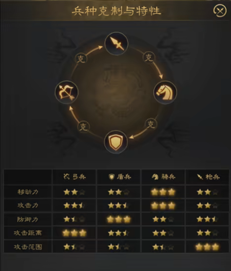 骑兵高机动,弓兵打得远,枪兵打两格,盾兵打斜角