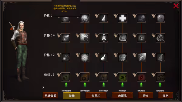 通过技能树路径、收集符文获得强力加成奖励以及提升基本技能的方式帮助角色不断成长。将点数加在爆炸物路径、攻击路径、生命路径、炼金术路径、物料路径或特有角色特有技能树分支上。