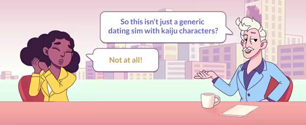 Don't worry if you're new to romance or don't speak any love languages because kaiju are notoriously non-verbal. Kaichu's two news anchors will interpret and report on the destructive courtship dance. Through the reporters’ expert analysis, the player learns about the preferences of the kaiju and apply that knowledge during each date’s relationship quiz to progress the story.DEMOLITION DATING