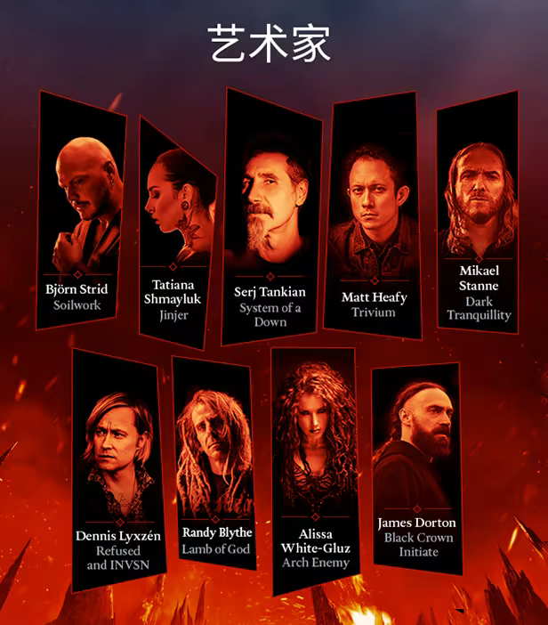 游戏中的每一首歌曲均由作曲家二人组Two Feathers专门为本游戏创作,并由Serj Tankian(System of a Down乐队)、Randy Blythe(Lamb of God乐队)和Alissa White-Gluz(Arch Enemy乐队)等一众金属乐大咖倾情演绎!
