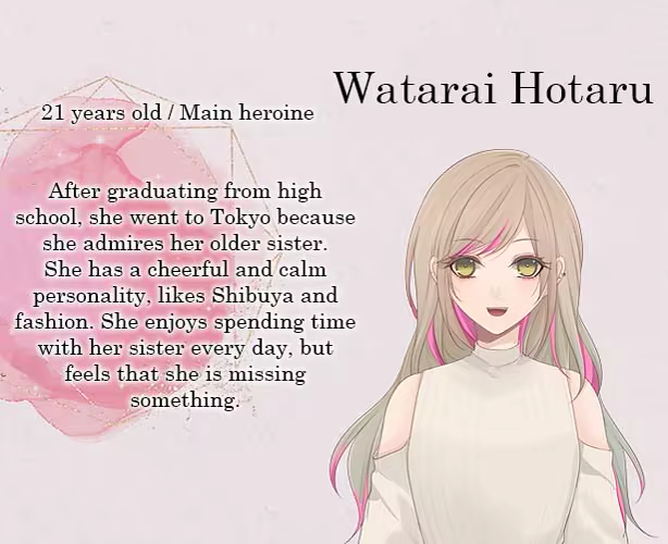主要女主角去了东京,因为她钦佩她的姐姐,她在这里当模特。她每天在便利店做兼职。她喜欢和她的朋友一起工作,但她的生活中缺少了一些东西……有一天,一个新朋友冲进了她的生活。特征: * 类型: otome,浪漫,生活片段,视觉小说。* 2个独特的结局。* 4个CG。* 完整的有声人物: 该项目由: 脚本,想法,编程: Ai Hanatsumi插图: Shimoshiro Shiro动画: Ogacha主打歌 “紫水晶掉落” 歌词,音乐: ai Hanatsume编曲,混音: Akatsuki (我的学院情结) 人声: aiMia (Ai Hanatsumi和Mai Yuduki)