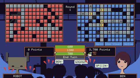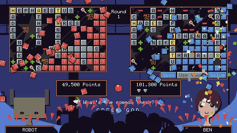 部分填词,部分战列舰,部分游戏表演. 单词 x 文字会让两个选手在一场寻词的智斗中互相攻击! 谁在三轮比赛中得分最多,谁赢得比赛.