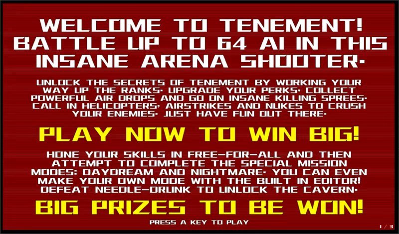 TENEMENT是一名单人玩家,2D离线竞技场射击手对抗最多 64个 哥们 暴风雨在8级左右 所有枪炮在用6种不同武器消灭敌人时都响亮 杀人犯赚到解锁 解锁意味着新角色、武器、级别和好处 选择您最喜欢的字符, 从14个不同的好处中选择升级它们 。 在完成上千个免费组合或者在"日梦"和"噩梦"任务模式中播放200个预先配置的情景时,点燃你的前导板. 设计自己的游戏模式,有100个自己的任务!