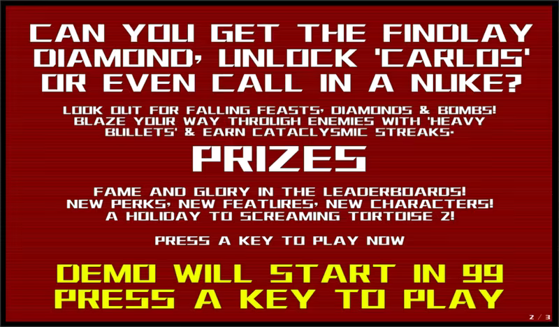 通过继续杀人,你(或敌人)赢得了召唤事物的能力。 这些力量可能非常强大 让你的杀戮达到几乎是滑稽的程度 游戏会疯狂,因为你实现了令人印象深刻的曲目, 反应与弹球风格 覆盖,图形后处理效果, 邪恶的声音 和惊人的音乐 从8个不同的作曲家之一 在游戏中工作。 神圣的空袭和核弹也以弹时风格的慢动作与宗教音乐和图像相结合,以制作精彩的电影时刻。 而现在的"东道主"会评论你每一步的剧情! 你甚至可以打开 宣誓模式 对于一点点 更大的影响。