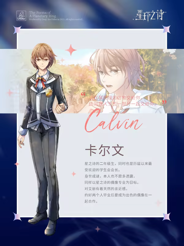 长篇×乙女向×模拟养成 欢迎来到星之诗学院!追求梦想的你,就是未来最璀璨的明星。——九种职业路线,七位可攻略角色,丰富的游戏系统,打造独一无二的演艺圈传奇。
