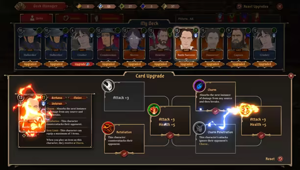 在《诸神灰烬:抉择》中,你需要使用角色卡和支援卡的组合来构建卡组。你的角色卡会被布置在战场上,而支援卡则会强化你的角色或施放强大的符咒。这两类卡牌都可以通过升级变得更强,而角色卡甚至可以获得新的技能,比如诡诈的反击或护甲粉碎攻击。