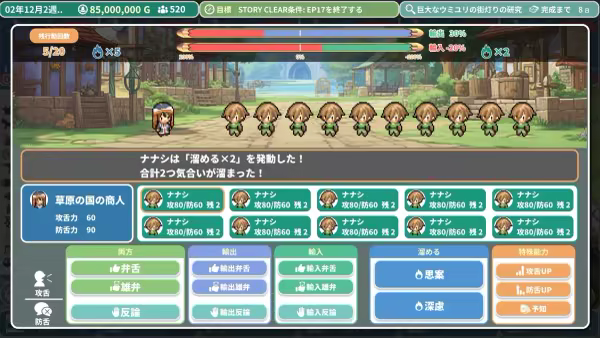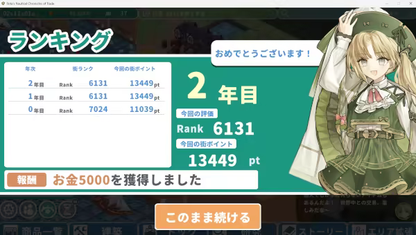 森林国公主罗塔制作的一款“城市建设”x“贸易”模拟游戏。 罗塞卡尼亚大陆通过从各国进口商品、加工和出口来积累财富。 有一天,统治邻国的国王征收高额关税,使得陆路贸易无法进行。 为了使她的国家摆脱困境,罗塔在港口小镇波塔马雷开始了新的海上贸易。 让我们通过利用船舶的贸易来大力发展波塔梅尔,以复兴罗塞卡尼亚为目标吧! 波塔马雷镇的居民分为三种类型:农民、商人和水手。 每个居民都有自己的技能,而对于商人来说,他们在商业谈判战中发挥着积极作用。 在城市周围建造各种设施并生产出口产品。 用像素艺术绘制的可爱居民一边在地图上移动,一边自言自语。 有时游客会参观这个城镇......?! 与其他国家的商务谈判可由罗塔本人或聘请商人进行。 最大的挑战是你能以多便宜的价格购买进口商品以及你能以多高的价格出售出口商品。 贸易是利用船只通过海上进行的。 船舶有不同类型,越大,可以运载的出口货物就越多。 此外,随着与新国家的贸易成为可能,设施的类型将会增加,并且他们将作为波特马雷的居民出现。 每年还举办一次排名活动,评价城市的发展程度。 让我们为Portamare的进一步发展而努力吧!
