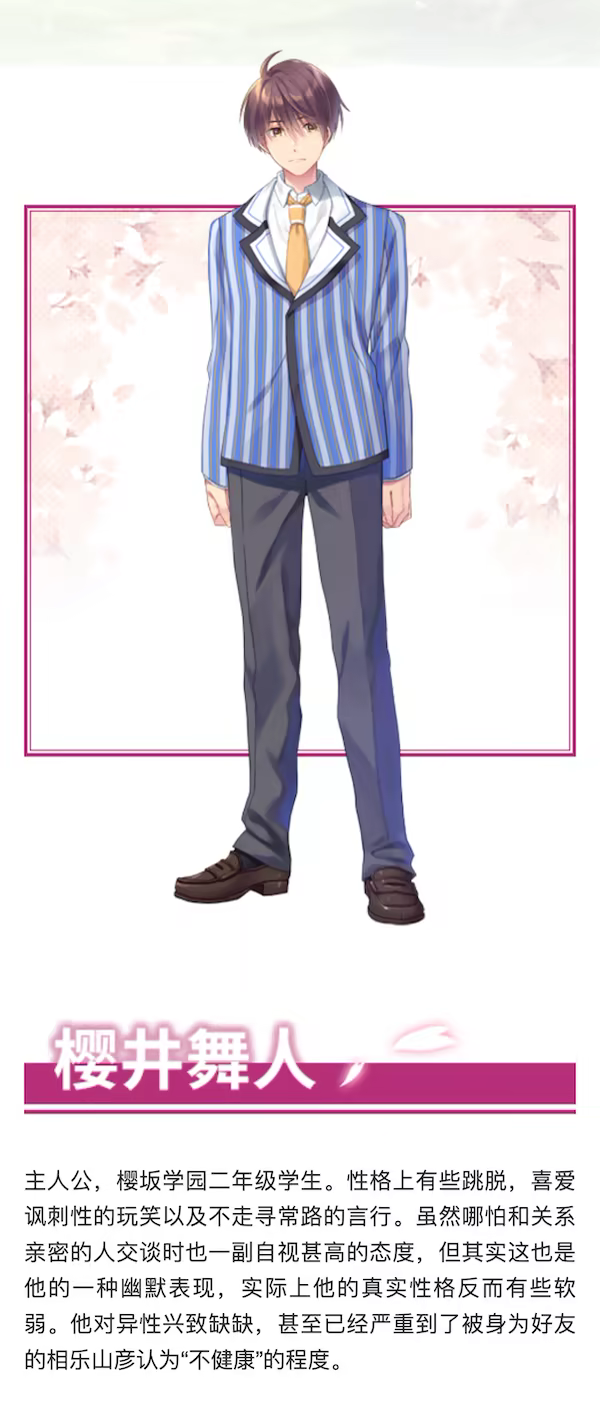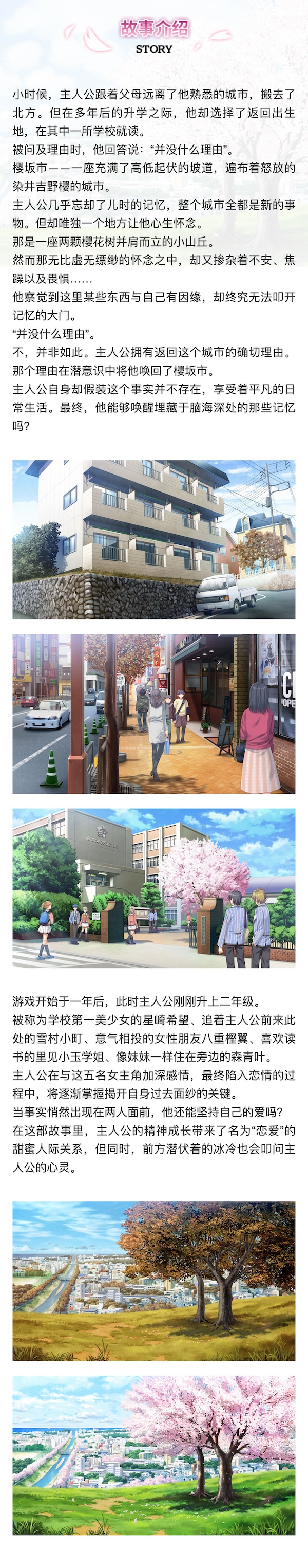 《繁花落舞恋如樱 -Re:BIRTH-》是由制作了《近月少女的礼仪》系列的日本美少女游戏资深大厂Navel为纪念品牌创立20周年的最新作。Steam版内置简体中文、繁体中文与日文三版本,支持36个Steam成就与集换卡牌以及云存储,并支持大量额外内容。 本作的原版是一款早在22年前就已广受赞誉的经典名作。本次重置版由原班人马对作品进行了原画完全重绘的同时也对剧情也进行了完善。像是《近月少女的礼仪》系列一样,本作也充满了槽点笑点。这部20年前的作品中的“笑点”能触动现代玩家的心吗?剧本家王雀孙是如此评价的:“笑点诚然有着时代的趋势,但也同时存在超越时代的普适笑点,如果现在的玩家能够像看待历史遗产一样宽容地发掘出前者的趣味,又能享受到后者所带来的快乐,捂着肚子大笑道现在玩起来也依旧搞笑,我一定会非常开心的。” 《繁花落舞恋如樱 -Re:BIRTH-》由业内知名女性原画师西又葵担当原画与角色设计;由创作了《我们没有翅膀》、《近月少女的礼仪》等话题名作的剧本家王雀孙主笔,并由颚屏障(已故,代表作《SHUFFLE!》)和森崎亮人(代表作《幸福噩梦》)担任副编剧。桃山伊音、夏和小、九条信乃等知名声优为女主角献声。继承自原作并重新编曲的主题曲《days》由老牌歌姬奥井雅美献唱,具有让人一听难忘的魅力。 “传说中又萌又搞笑的古怪作品”《繁花落舞恋如樱 -Re:BIRTH-》,望新老玩家多多支持! 游戏玩法 《繁花落舞恋如樱》是一部恋爱题材的视觉小说,玩家在其中扮演樱井舞人。它的大部分游戏玩法都花在阅读屏幕上出现的文本上,这些文本代表了故事的叙述和对话。文本伴随着角色立绘,这些立绘代表了舞人正在与谁交谈。同时画面上会显示作为故事发生地点的背景图像。在游戏中,玩家会在故事的某些情景下遇到特别剧情CG,这些CG显示的时候画面将不再显示背景与立绘。 玩家将有机会体验5条故事线,每条故事线都围绕着一位女主角展开。在整个游戏过程中,玩家有多个分歧点可供选择,在游戏进程中遇到分歧点会暂停,直到玩家做出选择。一些决定可能导致游戏过早结束。要完整查看所有的故事线,玩家需要反复重玩游戏并选择不同的选项以将情节推进到另一个故事线中。