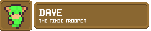 Dave has a very simple life, he fights for money to fund his gardening hobby. The food he grows enables him to be a vegetarian that eats meat. He loves his pet rock. Dave is a jack-of-all-trades with no glaring strengths or weaknesses who primarily attacks with his shield.