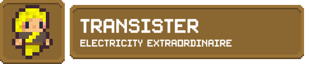 With a hobby for the classic arcade machines (Pac-dude and atmosphere invaders), Transister often needs to repair the frail wiring. During a fix, a minor shock from an arcade machine caused her to be given the ability to conduct electricity and use it to attack people. Transister gets value from her extensive combos and lightning-fast mobility, but is very light and short-ranged.