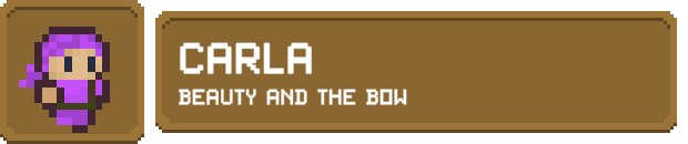 Carla liked to go camping, now with her skills honed in from years of hunting lunch from other people's tents, she is very good at hitting a stationary target. What about a moving target you ask? Well they never did that in practice. Carla does best at medium to long ranges, depending on how good her accuracy is, being able to keep opponents at bay with her quick projectiles, though she might have to get up close and personal to score the kill.