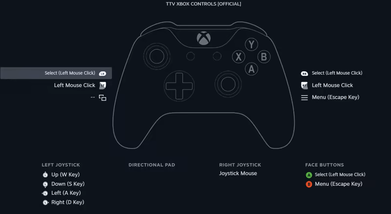 其他游戏板控制(XBOX,PS5+陀螺,SteamDeck)则使用Steam Introduction的虚拟控制器配置支持. 简单映射 [键盘 Escape] 和 [Mouse Left click] 的至少一个按钮, 并映射游戏杆到 [键盘 WASD] 或 [Joystick Mouse] 。 下面的例子。