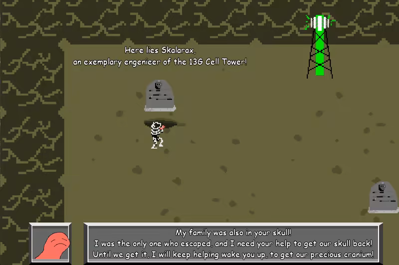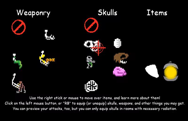 You control the skeleton as he rebuilds his body with weaponized limbs and powerful skulls. More powerful weaponry often requires the completion of side quests, from a multitude of NPCs, to acquire items. Skulls are gotten by hunting the very powerful bosses, and after defeating them, you can wear their heads as your own! These give you a multitude of unique powers, changing your playstyle and helping you beat the 13 unique bosses (including 4 mini-bosses), each with their own unique theme song!