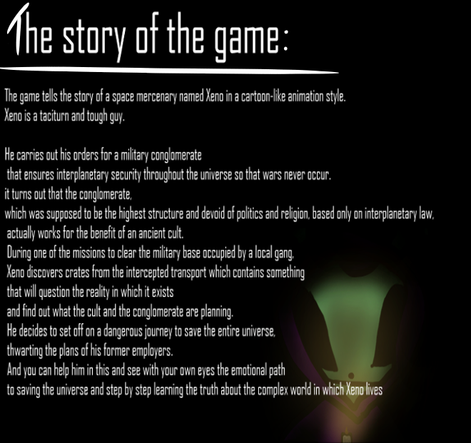 Xeno是一款2D平台游戏——我们左右移动并在游戏中跳跃,我们可以射击,在某些情况下可以偷偷地消灭敌人躲藏. 游戏还将以使用环境为特色,如exoskeletons或各种类型的车辆,以及谜题. 游戏剧情主要关注与老板的战斗,随着新阶段的出现,老板的战斗越来越多样化,难度也越来越大. 游戏游戏的多样化还有街机元素