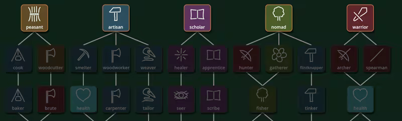 在旅途中可以学习新的技能. 技能树主要分为五个分支: