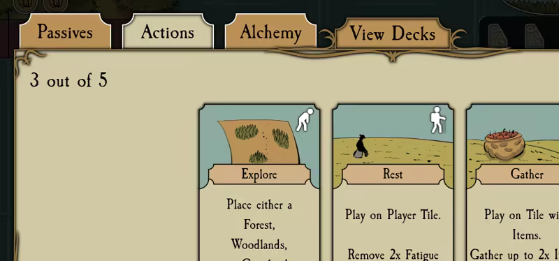 使用来自 三号 不同的甲板来探索,收集草药,休息和创造药剂. 通过添加被动,动作或Alchemy卡来构建您的甲板,或者替换现有的卡来帮助您在旅途中.