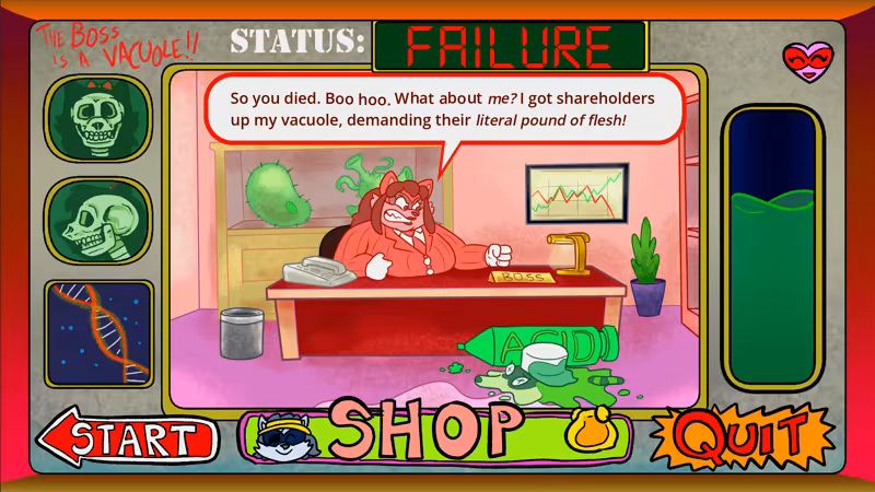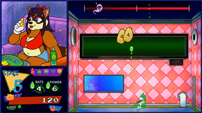 Rebbecca Valentine是只浣熊 胃口不错 这个游戏发生在腐败,经营不善的公司,也就是她的胃部. 你扮演一个低贱的工人细胞, 并履行危险的职责 打破食物 Rebbecca吃 用你的酸爆破器。 跟上Rebbecca的饮食习惯,因为这应该是铁胃,而你的老板期望结果——如果你失败,让她生病,她不会高兴!