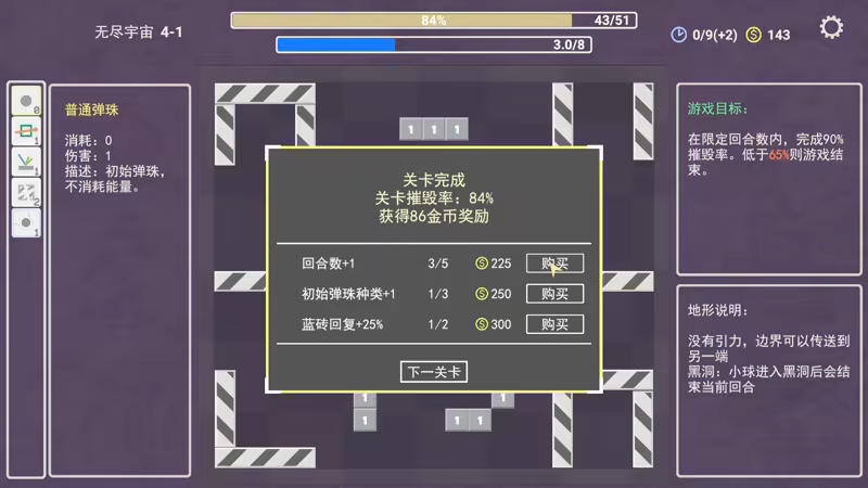 2. 每次关卡完成后会获得金币奖励,奖励数量取决于摧毁率,达到90%摧毁率为最高。使用金币可以购买一些属性提升。