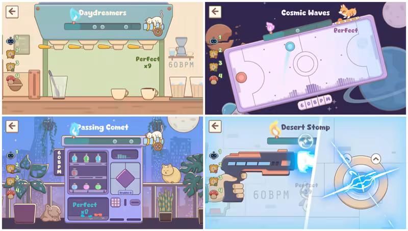 挑战你的节奏,享受原创的动感歌曲和每个关卡的惊喜,从宁静的星夜到激烈的战斗,舒缓的视觉效果一应俱全。准备好沉浸在60 BPM迷人世界中吧!