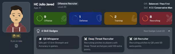 Ein XP来平息教练的进攻 防御 训练 以及招募技能 在整个职业生涯中选择新的技能徽章,每个徽章都为玩家的表现,发展,或招聘提供特别奖金.