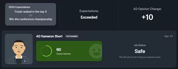 在教练生涯模式中,每所学校的体育总监都会有你满足的期望. 超越他们会让有声望的学校注意到,但缺失的期望可能导致你失业.