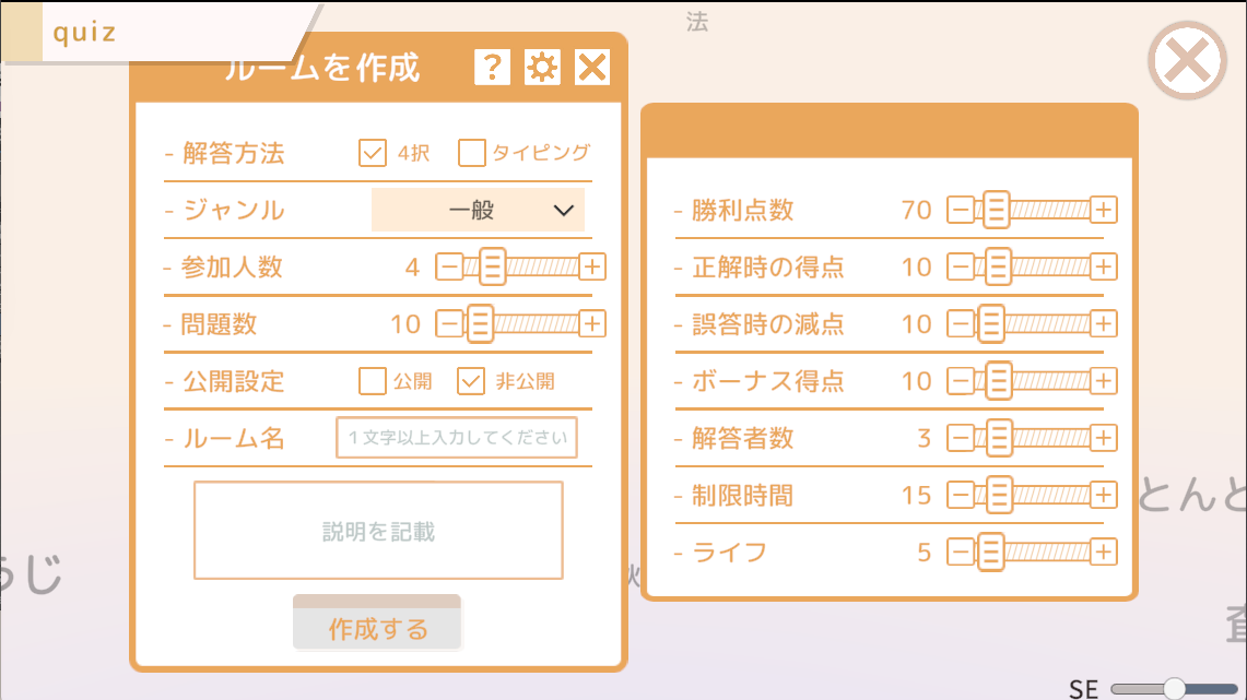 4択、タイピングそれぞれ自分で問題を作ることが可能!作った問題はルームマッチで使うことができるので、たくさんの問題を作っていろんな人と対戦しよう。