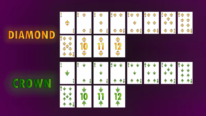 每个玩家发两张卡片。游戏有两副卡牌:钻石牌组和皇冠牌组(从1到12编号的卡片)。