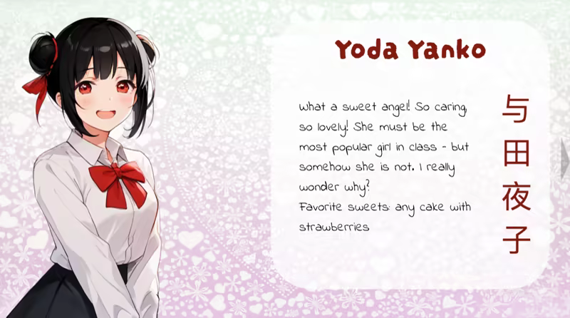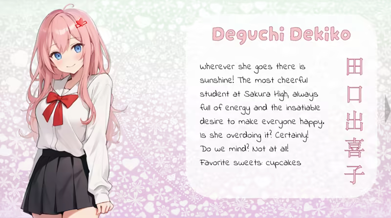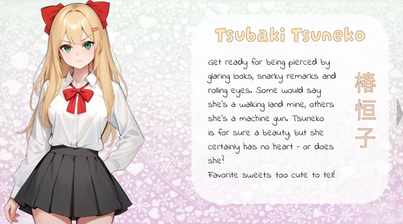 放松,有一个很好的时间与这个可爱和有趣的小游戏。新的学校,新的生活...在Sakura High的第一天遇到四个独特的女孩,每个女孩都有自己的特殊性格: 多刺的tsundere,甜美的deredere,害羞的kuudere和略带loop的yandere。然后是秘密的樱花协会,可能会破坏学校和您的爱情生活...与《甜蜜的科学》和《最后的秘密》的制作者制作的这本简短而超级可爱的视觉小说玩得开心。一个舒适的游戏时间的 “感觉良好的游戏”。