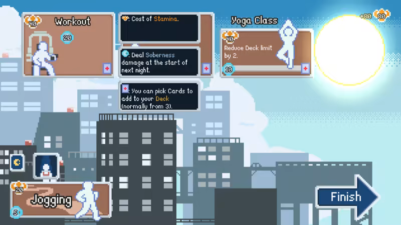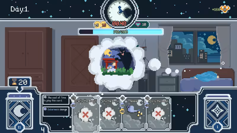 本游戏是一个单人Rougelike卡组构建游戏。玩家需要在夜晚通过消费时间打出卡牌来减少自己的清醒值。在夜晚过后的日间,玩家则可以消费体力来进行活动从而获得更多卡牌和各种增益。