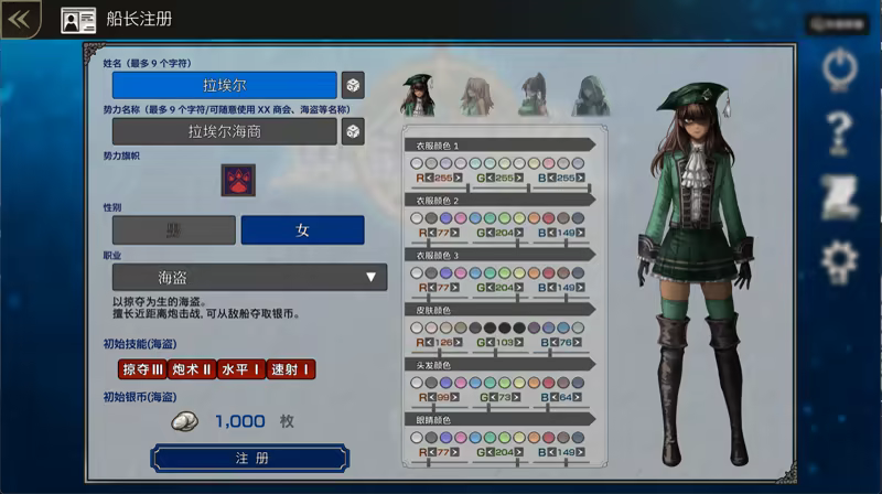 游戏开始前,先创建你的专属船长!可以自定义名字、势力名、职业、外观以及配色风格。