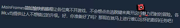 在MainFrames中,各位将会引导软盘。在引导的过程中,将会重新配置程序窗口、打造新路径、在帧之间跳跃来探险数码世界。在各位探险的所有区域中,充满了独特的视觉风格、创新的机械原理及各种隐藏的秘密。聆听沉稳的原声带,在游戏中进行各种迷人的益智游戏与平台游戏挑战课题等经验…也许你就不会想回到现实生活中!