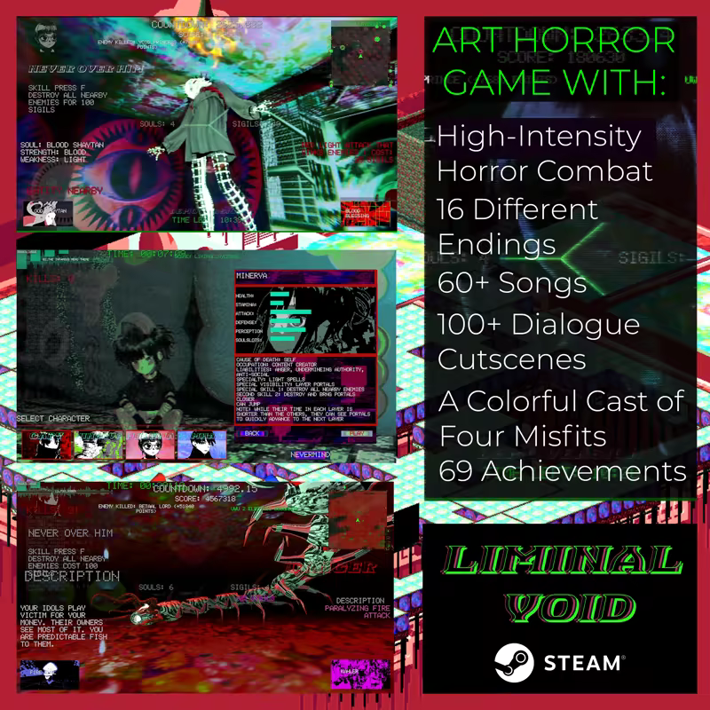 Liminal Void takes influences from Japanese horror, noise/breakcore electronica, punk, and even The Beatles to create an esoteric and visually stunning experience to remind you the joys of not knowing everything, free from the dependency of assurance and spoon-fed game mechanics. It is a game that is built from the ground up and comes at you with more hostility than other games. But that's okay, it will love you more than any other game ever could. You get A LOT of chances.