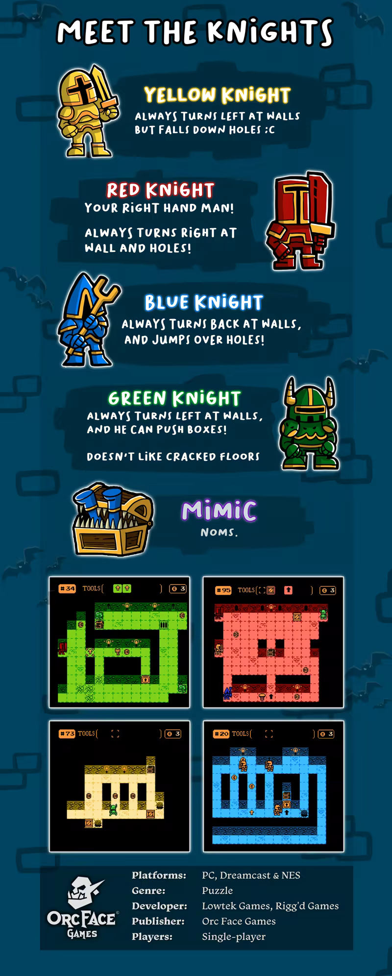 通过放置定向瓦片,泉水和盒子,引导无赖的骑士前往饥饿的宝藏胸前模仿,以避免障碍和敌人阻碍骑士和他们的宝藏.