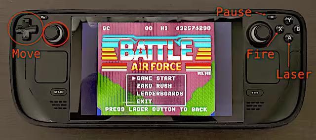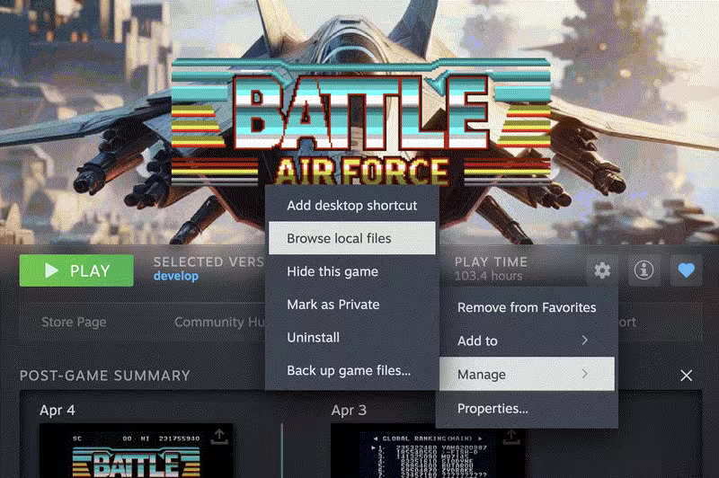 The GBA version ROM file is stored in a folder called “omake” which can be checked by clicking the Battle AirForce settings icon on the Steam client and selecting ‘Manage’ -> “Browse Local Files” to launch Explorer or Finder.
