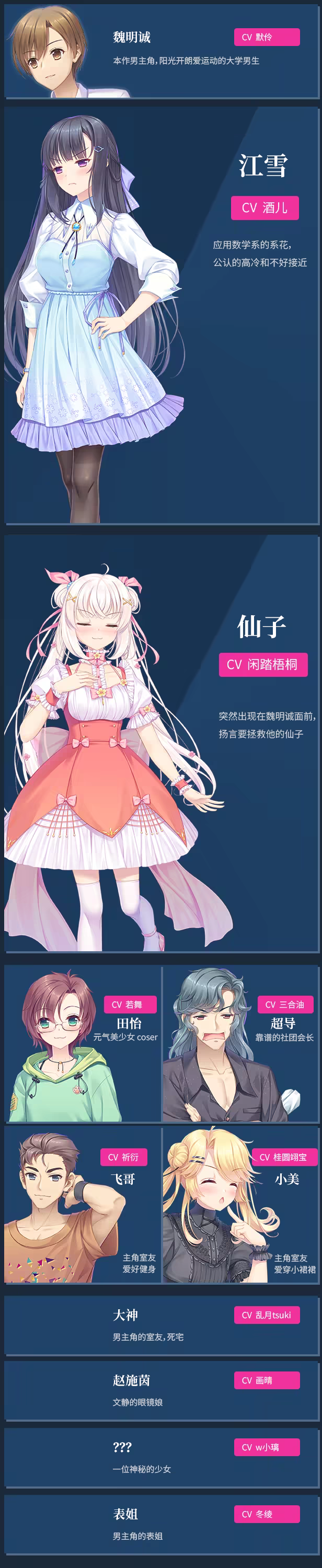 刚上大一,魏明诚就喜欢上了系花江雪。 到大二时,他终于按捺不住这份心情,对江雪表白了。 他被拒绝了。 正在魏明诚伤心失落之际,在他面前突然出现一位打扮奇特又可爱的女生,自称是仙子,要教魏明诚怎么追女生。 仙子说,“需要经过系统的学习,经历严酷的磨练,制定周全的计划,才能最终实现你的理想!” 魏明诚立刻决定接受仙子的帮助。 第二天,第一节课就要开始了。 这是一个甜蜜,青涩,酸苦的校园恋爱故事。 发生在桃花漫舞的,忧郁的,犹豫的春季。 这场从心碎开始的旅途,会走向怎样的结局呢? 22万字的扎实剧本。 相比上一部作品,故事节奏大幅优化,从光速降低为超音速,依旧十分紧凑,无日常无尿点。 没有魔法,扎根于现实的恋爱故事。 玩《书恋与君》,品现充人生。