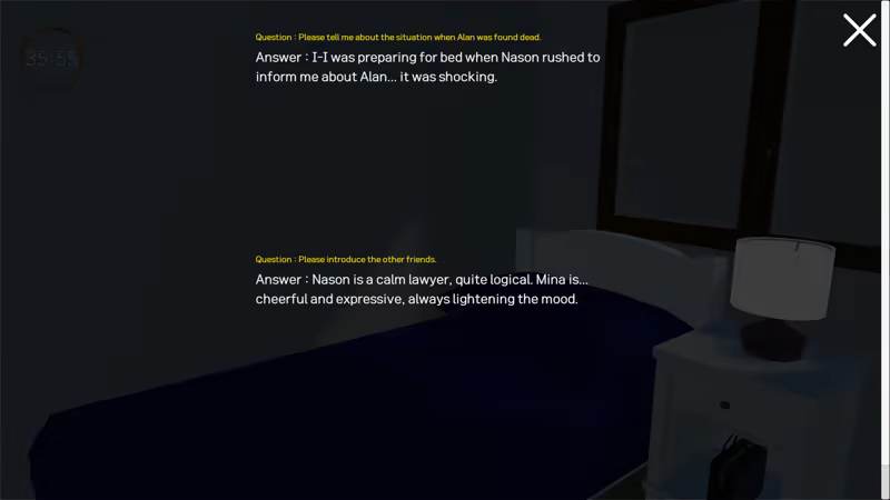 Interrogate NPCs powered by ChatGPT, each designed with a unique personality, backstory, and secrets.